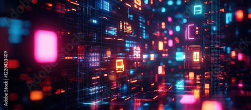 Abstract digital data stream, glowing neon lights, futuristic technology background.
