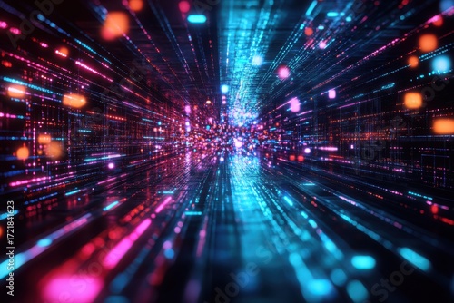 Abstract digital data stream with glowing neon pink and blue lights network