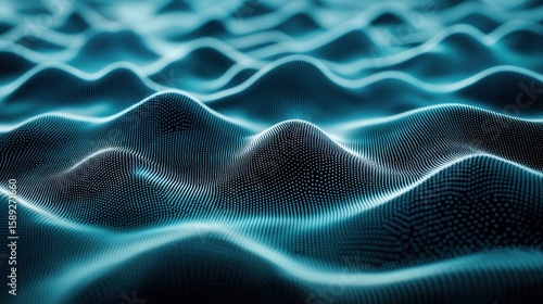 Abstract digital landscape. Wave patterns of light teal and dark teal. Dotted, textured surface