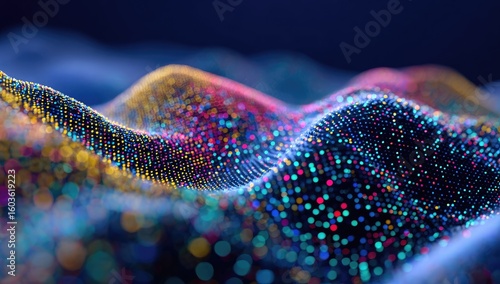 Abstract digital landscape of vibrant, multicolored particles undulating in a wave-like pattern across a dark background