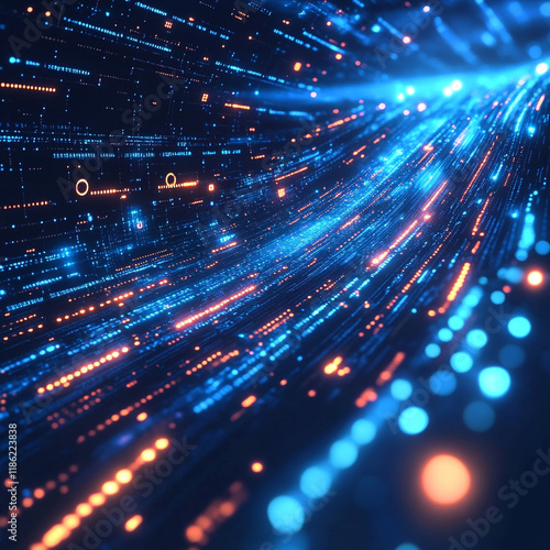 Abstract digital landscape showcasing flowing blue and orange light trails in motion