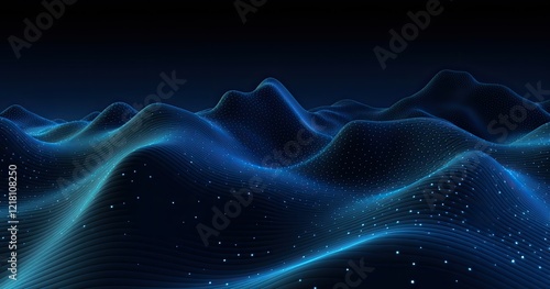 Abstract digital landscape with flowing waves and glowing particles in a dark setting.