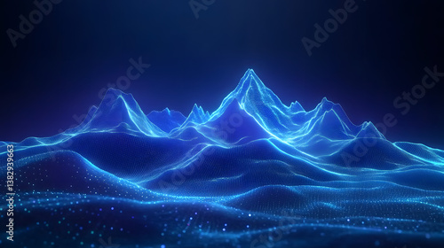 Abstract digital mountains range landscape with glowing light dots against a technology blue background. Futuristic low poly wireframe illustration conveying data mining and management concept.