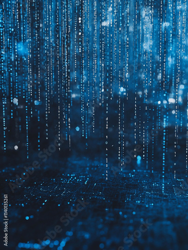 Abstract digital rain of blue light particles.