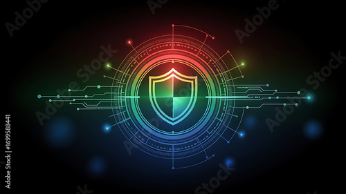 Abstract digital shield with glowing rainbow light effects and circuit board patterns on dark background