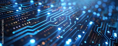 Abstract digital tech background with binary, light neon and circuit concept. Perfect for artificial intelligence, data transfer, cyber, encryption, neural network.