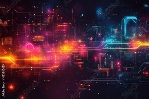 Abstract digital technology background with glowing lines and neon colors.