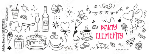 Abstract elements for parties in the doodle style. invitations, bright banner about summer, postcard, invitation, plant, cocktails in a minimalist style. modern, isolated icons: bow, dessert. png