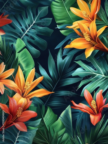 Abstract foliage botanical seamless background. Colorful wallpaper of tropical plants, flowers, floral, leaf branches. Foliage of exotic plants in summer for banner, prints, decor, wall art.