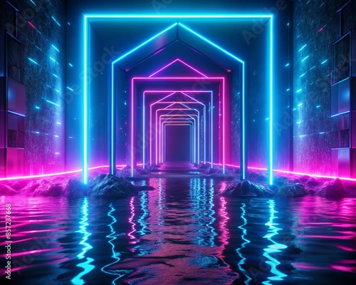 Abstract futuristic background, blue and pink neon lights gate with three dimensional glowing reflected in water.