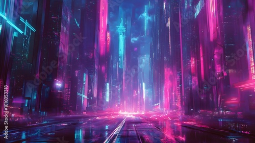 Abstract, futuristic city of concrete and neon. Night city view, illumination. Dark street, abstract scene, neon rays.