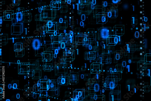 Abstract futuristic cyberspace with binary code, matrix background with digits and cubes. 3D rendering