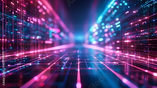 Abstract futuristic data stream tunnel with glowing pink and blue light particles and lines moving at high speed. Technology and digital highway.