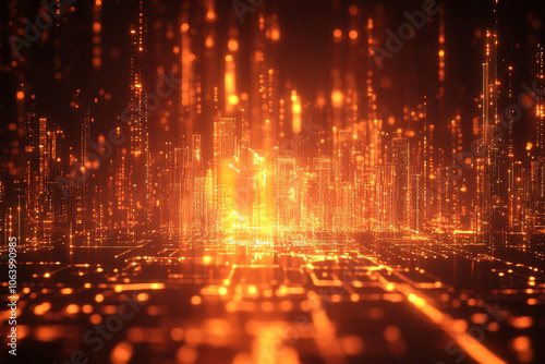 Abstract futuristic digital cityscape illuminated by bright orange lights with data streams flowing around