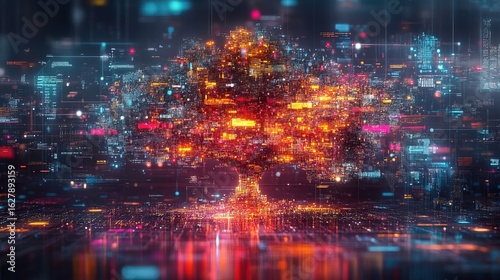 Abstract Futuristic Glowing Circuit Tree with Cityscape Background Illustration