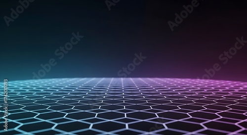 Abstract Futuristic Hexagonal Grid Surface with Blue and Pink Neon Glow Effect