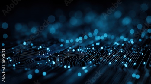 Abstract futuristic technology background with a glowing blue circuit board and data nodes representing network connections