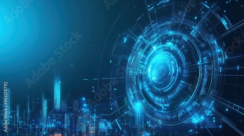 Abstract futuristic technology background with blue digital circular waves and hologram elements, representing data transfer, advanced security systems, and global network concepts. This design captur