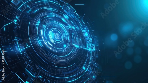 Abstract futuristic technology background with blue digital circular waves and hologram elements, representing data transfer, advanced security systems, and global network concepts. This design captur