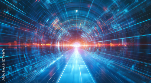abstract futuristic tunnel with neon lights and a digital data background,