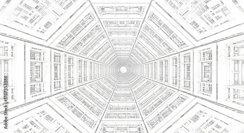 Abstract geometric architectural tunnel perspective drawing with repeating patterns