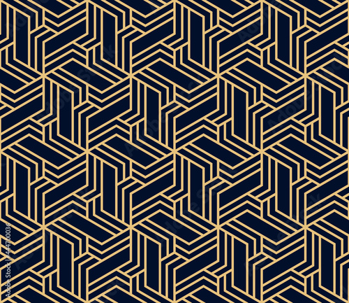 Abstract geometric pattern with stripes, lines. Seamless vector background. Gold and dark blue ornament. Simple lattice graphic design