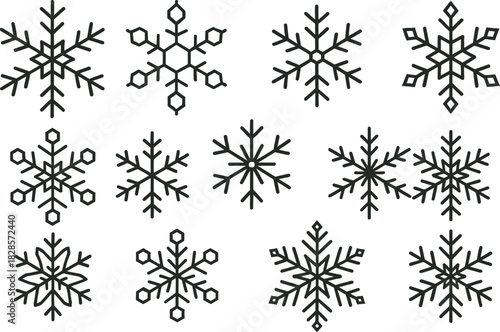 Abstract geometric snowflake symbols constructed with radial polygon shapes in clean flat vector style