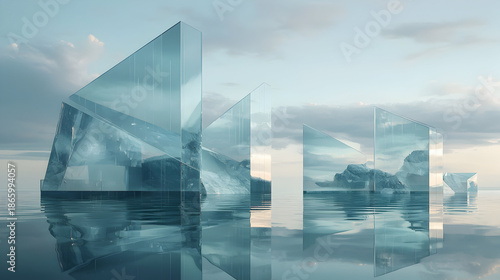 Abstract Glass Structures Resembling Icebergs on Water Under Cloudy Sky and Horizon