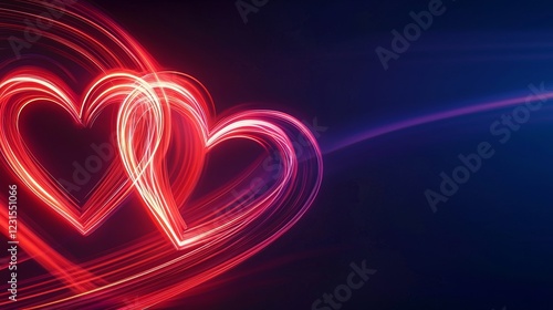 Abstract glowing hearts made of light trails, dark background, high contrast, elegant minimalism