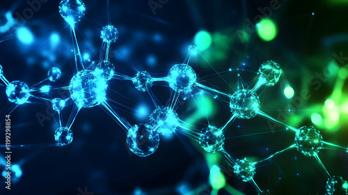 Abstract glowing molecular network with interconnected nodes and lines in blue and green tones, set against a dark background with high detail