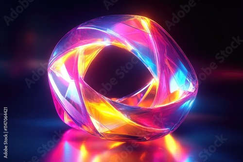 Abstract glowing orb, vibrant pink, blue, and yellow neon lights intertwining in a mesmerizing, digital art.