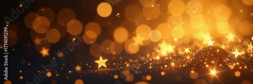 Abstract gold bokeh, star glitter, circle glow Copy space for Xmas/NY greetings , backdrop, new year, bright
