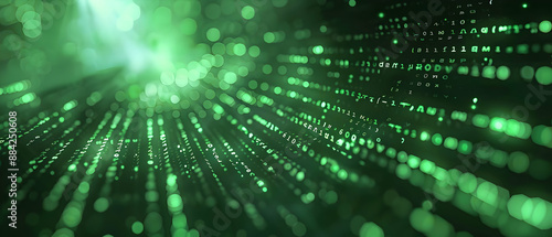 Abstract green digital data visualization, futuristic green glowing particles and light trails, technology backgrounds for modern designs.