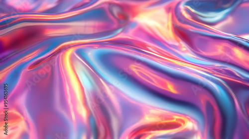 Abstract holographic pink, blue and yellow background with wavy texture.