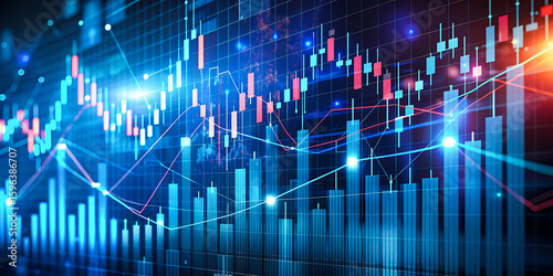 Abstract Infographic Visualization Glowing Financial Charts and Graphs. Emphasizing Dynamic Growth and Market Fluctuations. Abstract Background with Blue Lights.