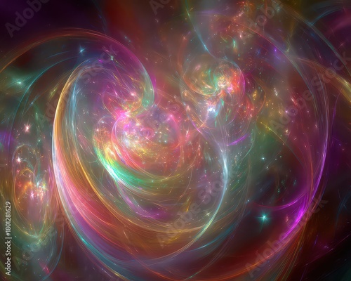 Abstract Iridescent Energy Swirls Resembling Celestial Nebula with Pink Purple Green and Gold Tones in a Dark Background Creates a Cosmic Space Atmosphere