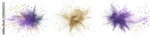 Abstract isolated white background, explosion splashes of colored powder dust, texture, design, banner. AI generation.