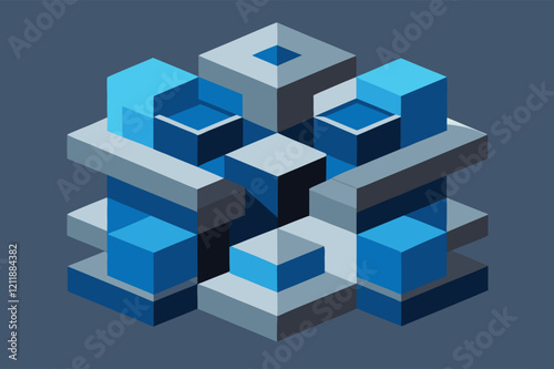 Abstract Isometric Cube Structure Blue, Gray, Geometric Shapes.