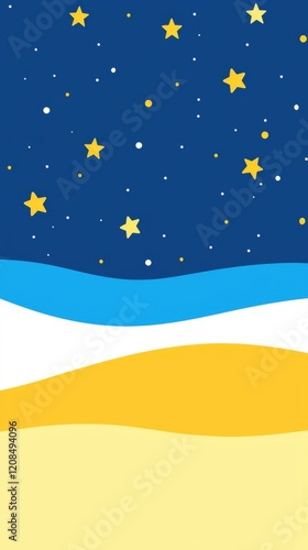 Abstract landscape painting featuring a dark blue night sky filled with yellow stars and white spots above rolling yellow hills separated by blue and white stripes