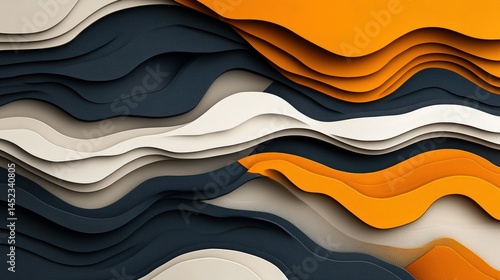 Abstract layered wavy shapes in orange, navy, and cream colors