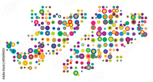 Abstract map of the Falkland Islands drawn with overlapping colored circles like sweets or candies