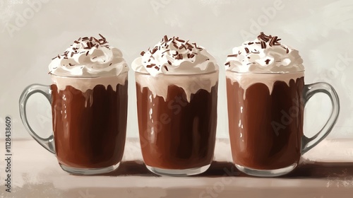 abstract marketing background showcasing two 3D cups of hot chocolate topped with fluffy whipped cream and chocolate shavings. This festive design is perfect for recipe blogs, social media posts, and