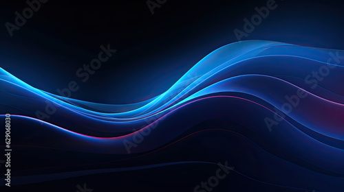 abstract minimal neon background with glowing wavy line. Dark wall illuminated with led lamps. Blue futuristic wallpaper