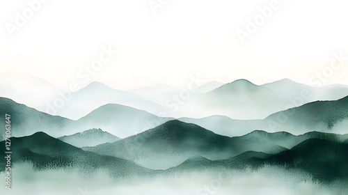 Abstract minimalist landscape painting with green watercolor mountains fading into a white background. Soothing and calming image, perfect for wall art or as a background for your designs