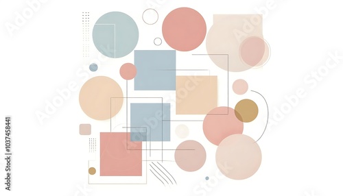 Abstract minimalist shapes with soft pastel squares and circles against a white background
