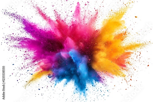 Abstract multicolored powder explosion on white background. Colorful dust explode.