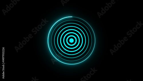 Abstract neon circle design with concentric rings displaying bright blue glow on dark black background