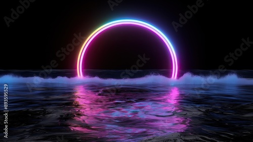 abstract neon light arc reflection on water surface at night