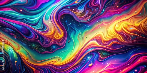 Abstract Neon Rainbow Liquid Marble Texture Background with Swirls and Waves, Holographic Psychedelic Pattern, Glitch Effect Ideal for Banners and Wallpapers in Low Light Photography