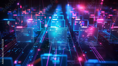 Abstract network grid with files and folders, futuristic software interface, digital document management system, store, search and organize documents, corporate business, paperless office. banner,